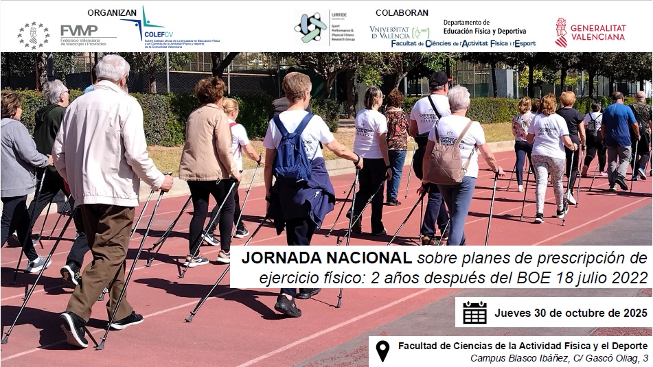 Valencia a 27 de octubre de 2025 — La Facultad de Ciencias de la Actividad Física y el Deporte de la Universitat de València será el próximo 30 de octubre el punto de encuentro estatal sobre prescripción de ejercicio físico, con la Jornada Nacional sobre Planes de Prescripción de Ejercicio Físico: 2 años después del BOE 18 julio 2022.